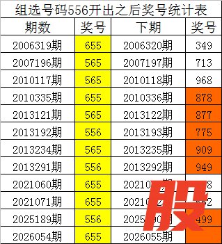 体彩排列三组选号码556历史上出现了12次,其下期奖号分别为:349、713、968、878、877、775、909、949、368、562、499,详细统计见下表: