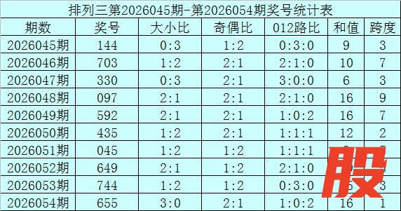 上期回顾:排列三第2026054期奖号为655,奖号012路比为1:0:2,奇偶比为2:1,大小比为3:0,和值为16,跨度为1。
